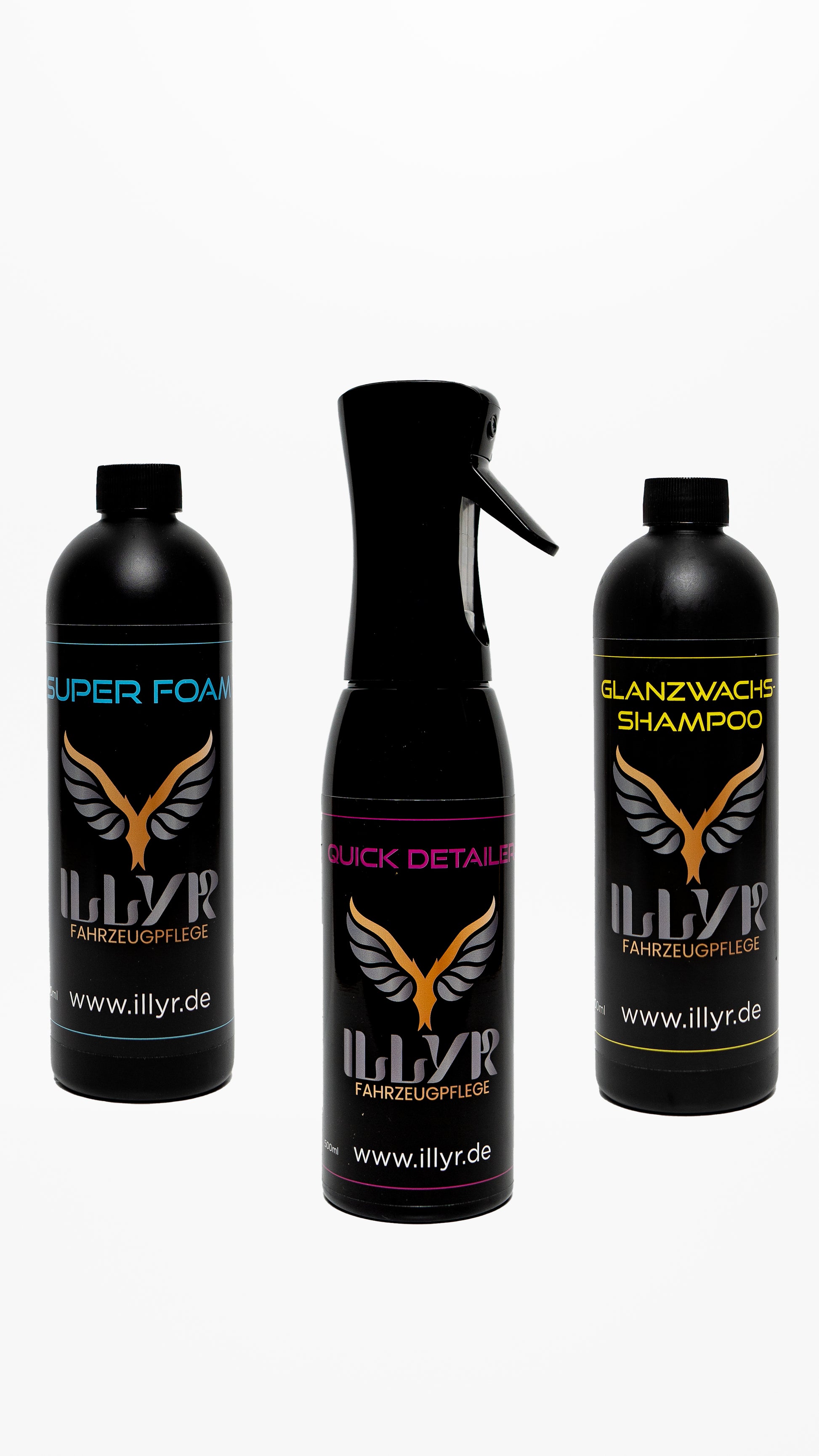 Die Illyr Fahrzeugpflege-Produktlinie bietet ein umfassendes System zur Fahrzeugreinigung und -pflege, bestehend aus drei hochwirksamen Produkten: